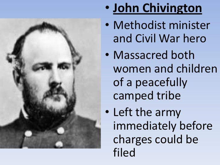 Chivington was born in lebanon, ohio on january 27, 1821, the son of isaac and jane chivington, who had fought under general william henry harrison against members of tecumseh's confederacy at the battle of the thames. Army troops at the sand creek massacre, colonel john chivington was born in lebanon, ohio in 1821. The sand creek massacre (also known as the chivington massacre, the battle of sand creek or the massacre of cheyenne indians) was a massacre of cheyenne and arapaho people by the u.s.
