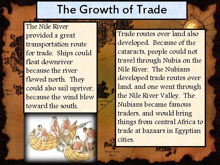 Answerd by sjwade 4 days ago 28 4.2. Answer they conveyed merchandise from focal africa and nubia into egypt and southwestern asia and brought different products back. It all depends on the needs of its people.